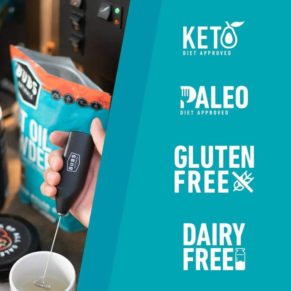 SE MEZCLA FÁCILMENTE: aumenta el valor nutricional de tu comida favorita. Mezcle este aceite cetogénico MCT en polvo con sus batidos de proteínas, productos horneados y bebidas calientes. ¡También es excelente como crema para café sin lácteos!