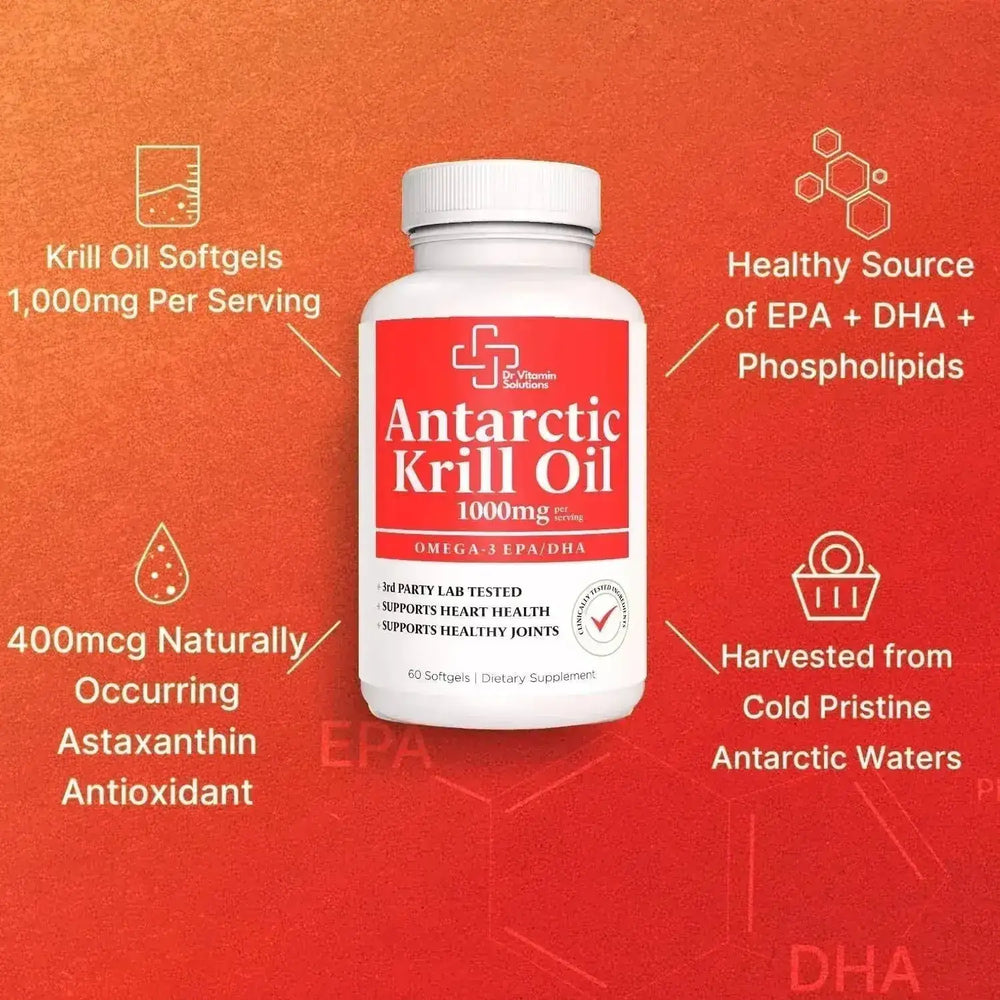 Aceite de krill antártico 100 % puro: solo utilizamos krill de origen superior cosechado en las aguas de la Antártida. El aceite de krill de Dr. Vitamin es 3 veces más potente que las alternativas. 1000 mg por porción (2 cápsulas blandas).