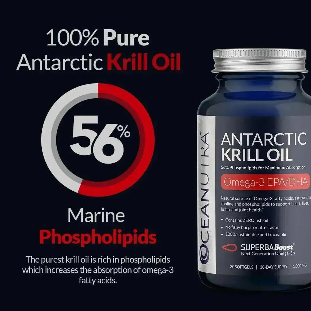 Compárenos: desde tan solo 57 centavos por día. Lea las etiquetas: somos transparentes. Los productos económicos o de menor calidad pueden contener aceite de pescado y quién sabe qué es una mezcla patentada, pero el contenido de fosfolípidos es una señal segura de pureza. Aceite de krill 100 % puro capturado en la naturaleza Oceanutra, los niveles más concentrados son del 56 % (PL56) xl. Más alto que Superba 2 con un 40 %, otros afirman ser krill, con niveles tan bajos como el 5 %, lo que generalmente significa que son mezclas y son predominantemente aceite de pescado, aceite de hígado de bacalao. CONTIENE MARISCOS
