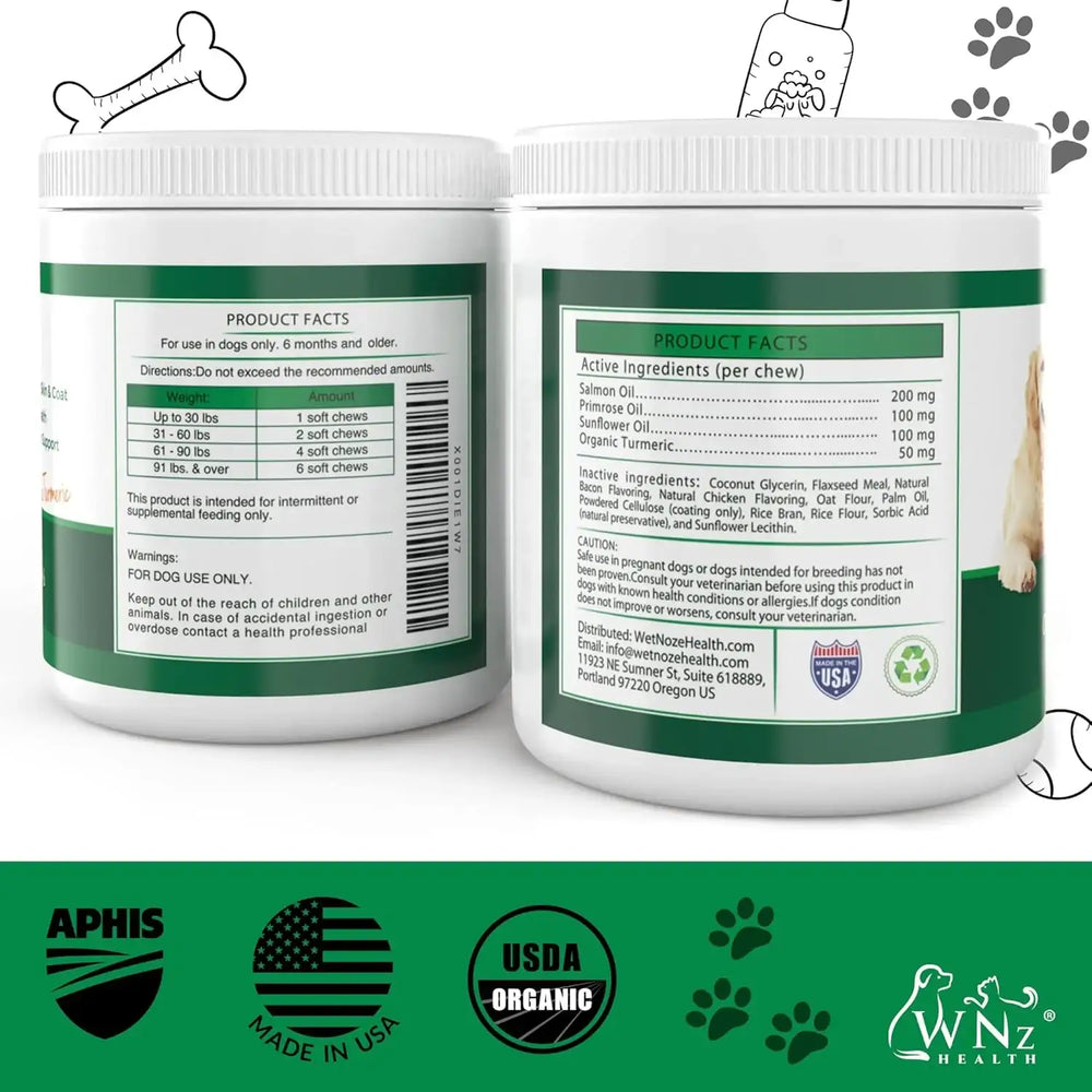 Pelaje Brillante y Exuberante: Este suplemento de Omega 3 para perros ofrece tratamiento para la picazón, la descamación, la inflamación y la sequedad de la piel. Nuestros suplementos masticables de Omega 3 para la defensa del pelaje tratan las zonas sensibles y cualquier irritación de la piel para promover un pelaje brillante y exuberante que te encantará acariciar. Un sabor que le encantará a tu perro: Los masticables WetNozeHealth Omega 3 para perros están elaborados con aceite de salmón natural para la piel y el pelaje, y tienen un delicioso sabor a pollo y tocino. Estos masticables de aceite de pescado para perros están enriquecidos con aceite de girasol, aceite de onagra y cúrcuma orgánica, un suplemento natural para el pelaje que ofrece múltiples beneficios.