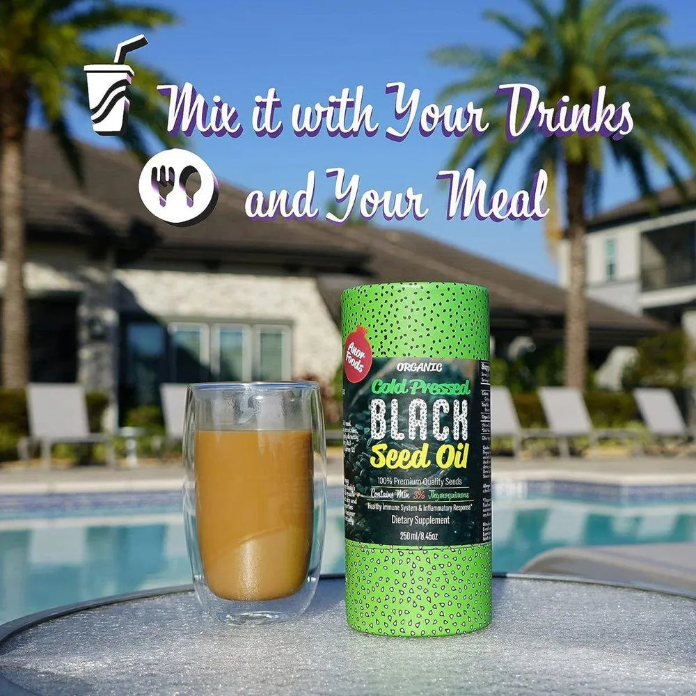 POTENTE ANTIOXIDANTE. El aceite de semilla negra contiene poderosos antioxidantes, incluida la timoquinona, que puede ayudar con el estrés oxidativo de las células y la inflamación. El aceite de semilla negra puede favorecer la salud del sistema digestivo y la función cardíaca saludable. Tiene un sabor fuerte, amargo y picante.