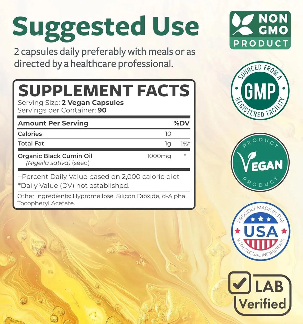 Redescubra un antiguo secreto: el aceite de semilla negra (también conocido como aceite de kalonji) se ha utilizado tradicionalmente durante miles de años, ¡ya en los faraones egipcios! Ahora, está experimentando un resurgimiento de popularidad e interés científico. El aceite de semilla negra puro prensado en frío en forma de cápsula blanda es difícil de encontrar en el mercado actual. Ordene su suministro para 90 días (1 botella) de este antiguo secreto y disfrute de los innumerables beneficios de esta planta única que está arrasando en el mundo científico.