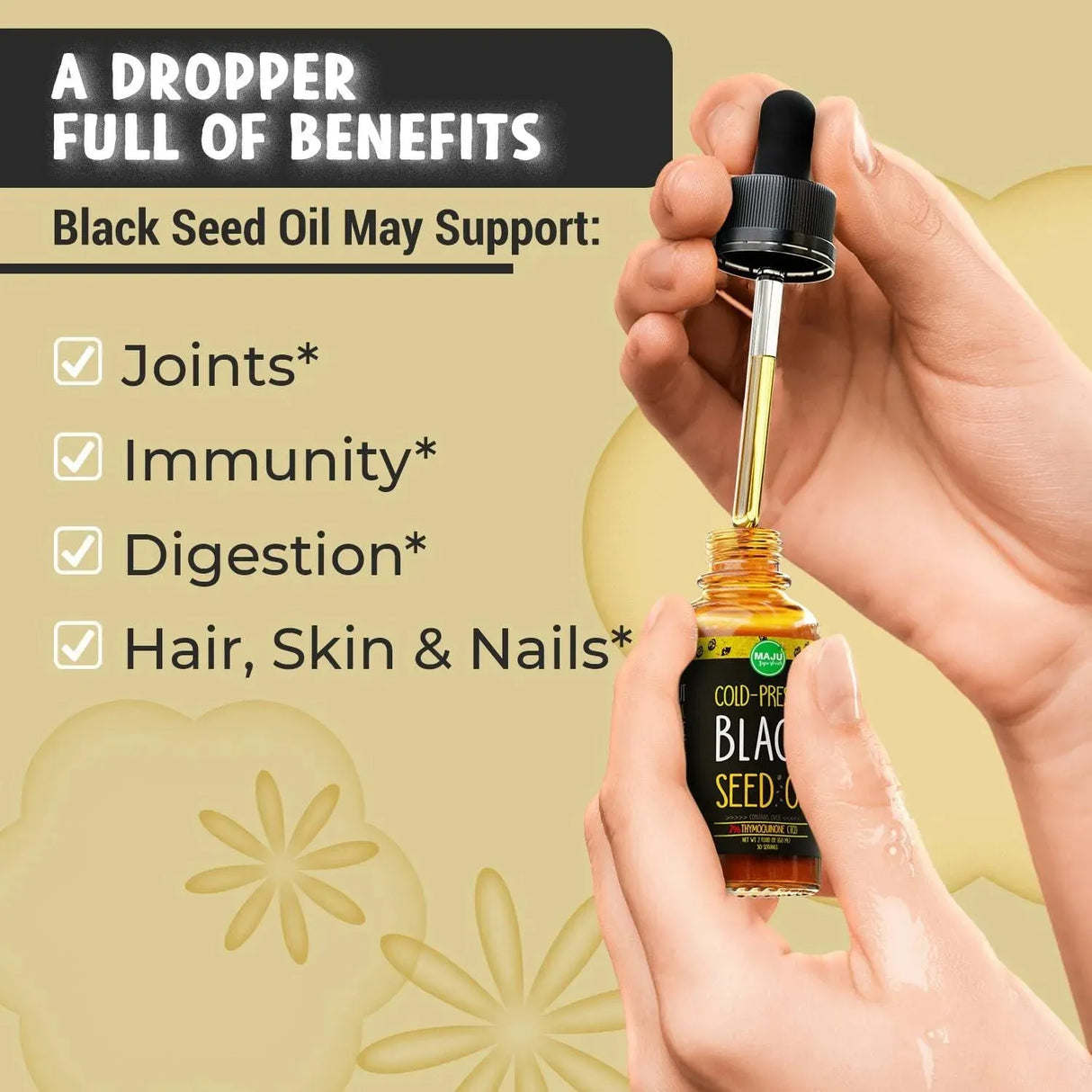 Puede apoyar las articulaciones, la piel, el cabello y las uñas: el aceite de semilla negra (también conocido como aceite de Kalonji) está repleto de poderosos nutrientes que pueden ayudar a lograr una apariencia juvenil y vitalidad que notarás. Contiene una gran dosis de omegas, aminoácidos y antioxidantes. Lo consideramos una fuente extremadamente importante de aceites grasos para tu vida diaria tal como lo hacían los antiguos egipcios y otomanos. A la gente le encanta tomarlo para el crecimiento del cabello.