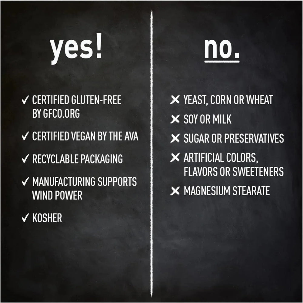 • Elaborado de forma responsable: certificado, sin gluten, vegano, halal, kosher y verificado sin OGM, elaborado con envases reciclables, la fabricación de este producto respalda la energía eólica. Este producto no contiene levadura, maíz, trigo, soja, leche, conservantes ni colorantes, saborizantes ni edulcorantes artificiales.