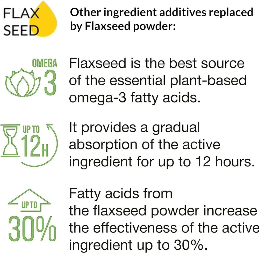 POLVO DE LINAZA EN CADA CÁPSULA: Los ácidos grasos omega proporcionan una absorción gradual del ácido R-lipoico por hasta 12 horas y aumentan la efectividad en un 30%.