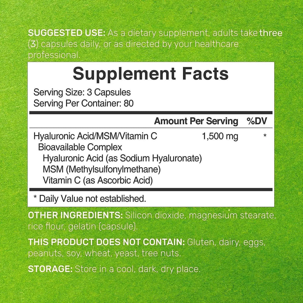 Dosis y porciones: 240 cápsulas por frasco con solo 3 cápsulas por porción y un suministro de hasta 80 días. Mezcla patentada de alta biodisponibilidad de 1500 mg de ácido hialurónico como hialuronato de sodio, MSM como metilsulfonilmetano y vitamina C como ácido ascórbico por dosis.