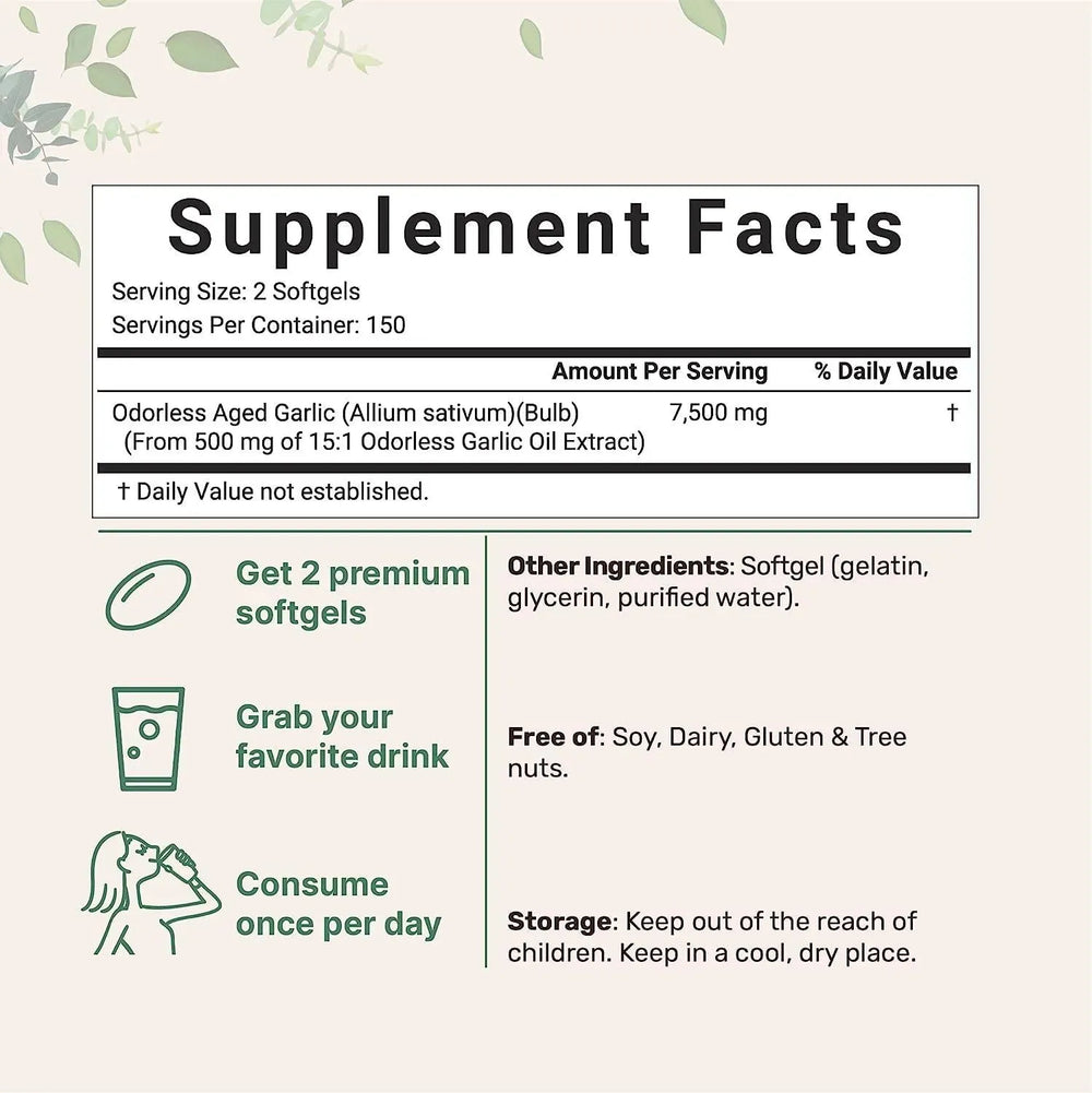 Cápsulas blandas de extracto de ajo inodoro de alta potencia de Micro Ingredients. Ofrece una dosis equivalente a 7500 mg de ajo por ración. Incluye 300 cápsulas blandas en total, lo que equivale a un suministro a granel para 5 meses.
