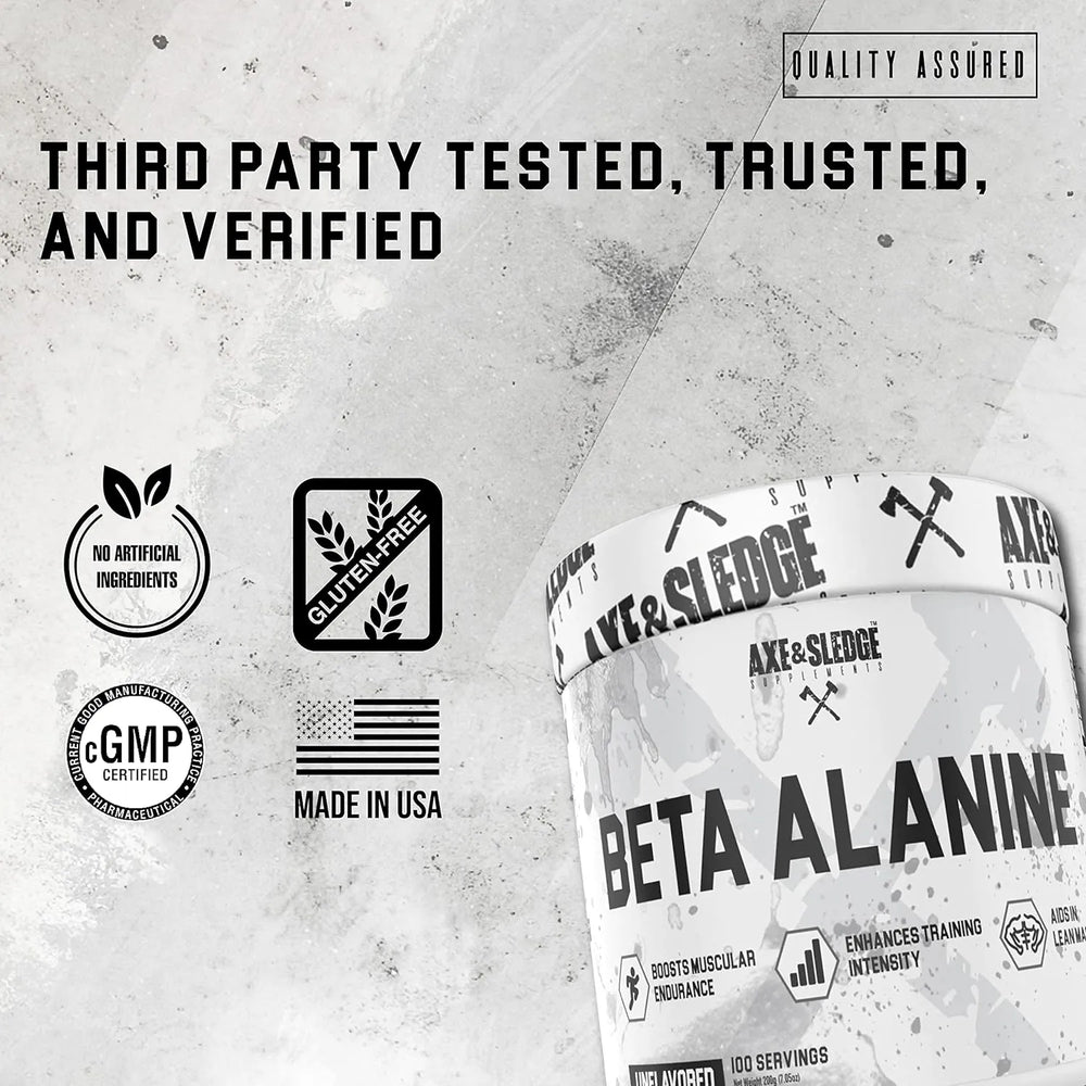 Axe & Sledge Beta Alanine se fabrica en una instalación de última generación registrada e inspeccionada por la FDA y certificada por cGMP ubicada en los EE. UU.