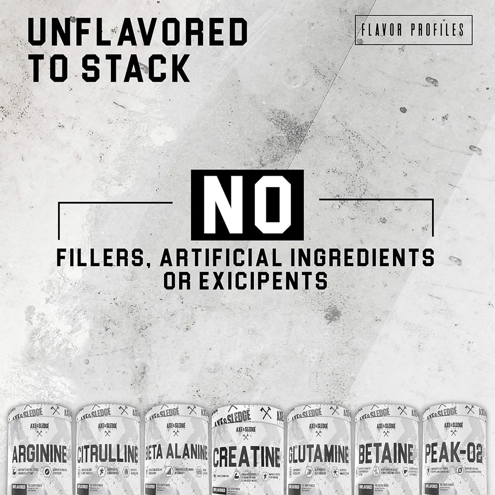 Axe & Sledge Beta Alanine contiene 2 gramos de beta-alanina por porción sin rellenos, excipientes ni sustancias artificiales añadidos
