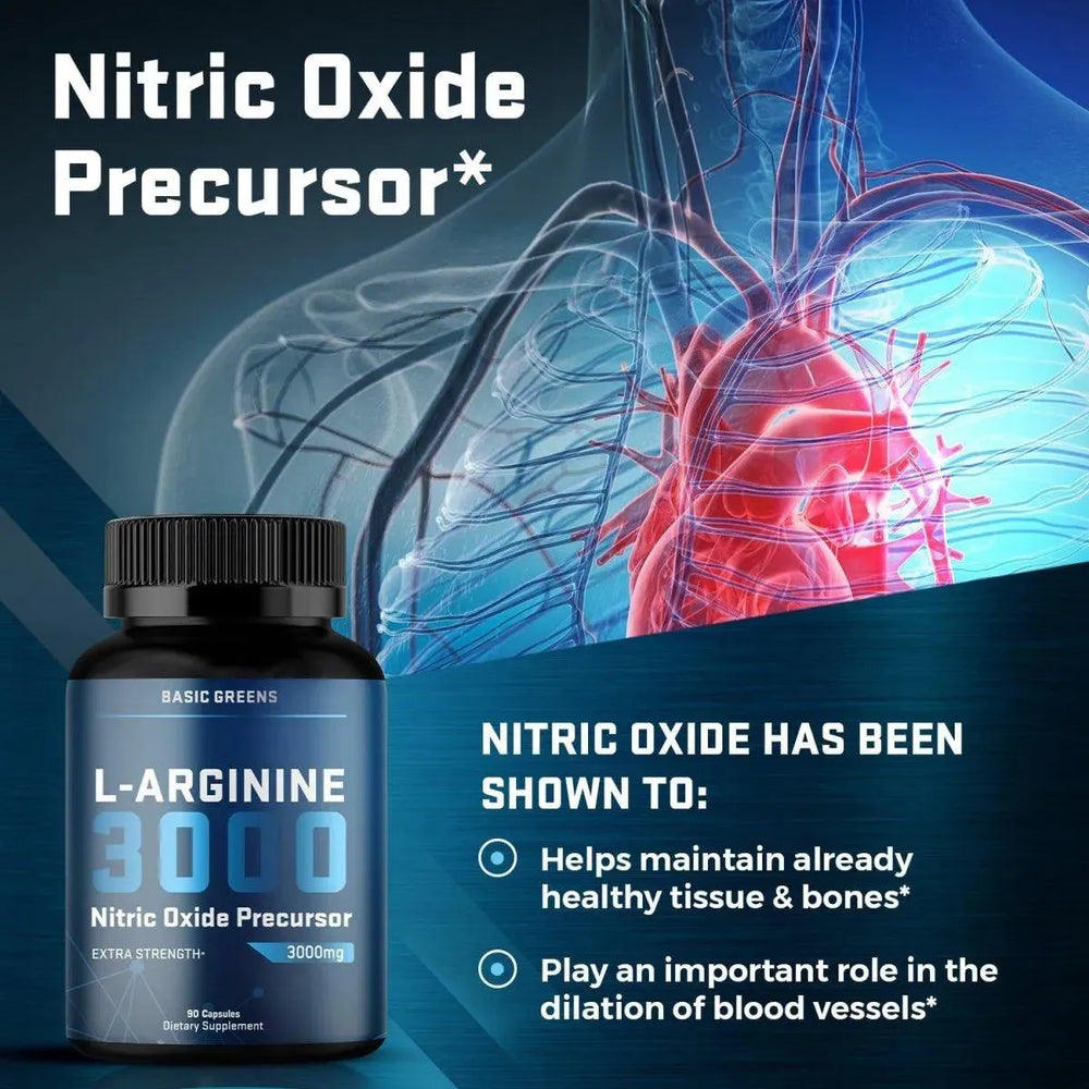 Óxido nítrico de máxima potencia: consigue tu mejor rendimiento con el suplemento premium de l arginina de Basic Greens. Formuladas con la mejor combinación de aminoácidos de l-arginina (clorhidrato) y AAKG (alfa-cetoglutarato de arginina), estas tabletas participan en la producción de óxido nítrico, que ayuda a mantener una circulación saludable. La arginina también sirve como componente básico de las proteínas.