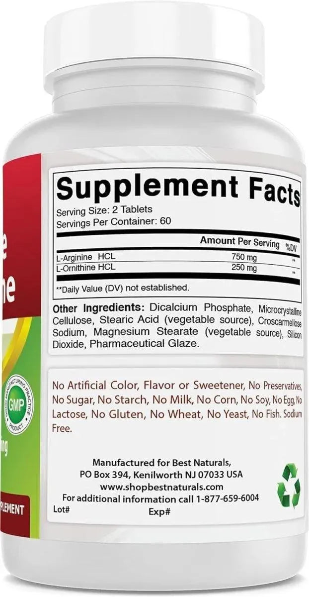 Best Naturals L-Arginine L-Ornithine 1000Mg. 120 Tabletas 3 Pack