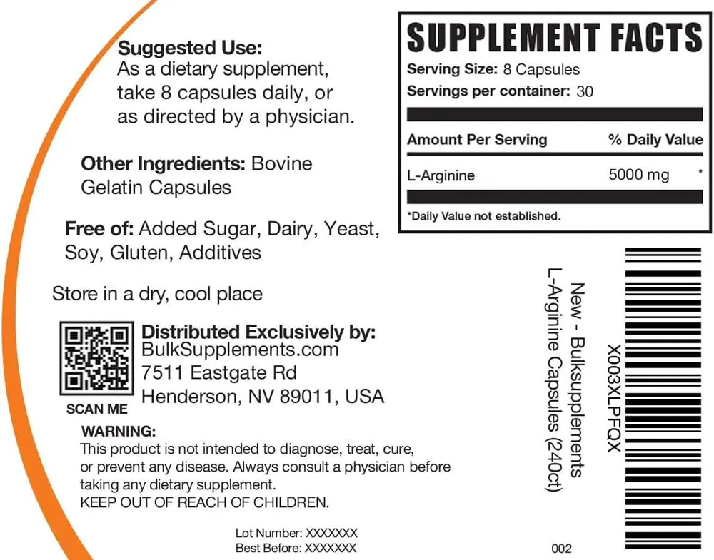 Bulk Supplements L-Arginine 5000Mg. 240 Capsulas