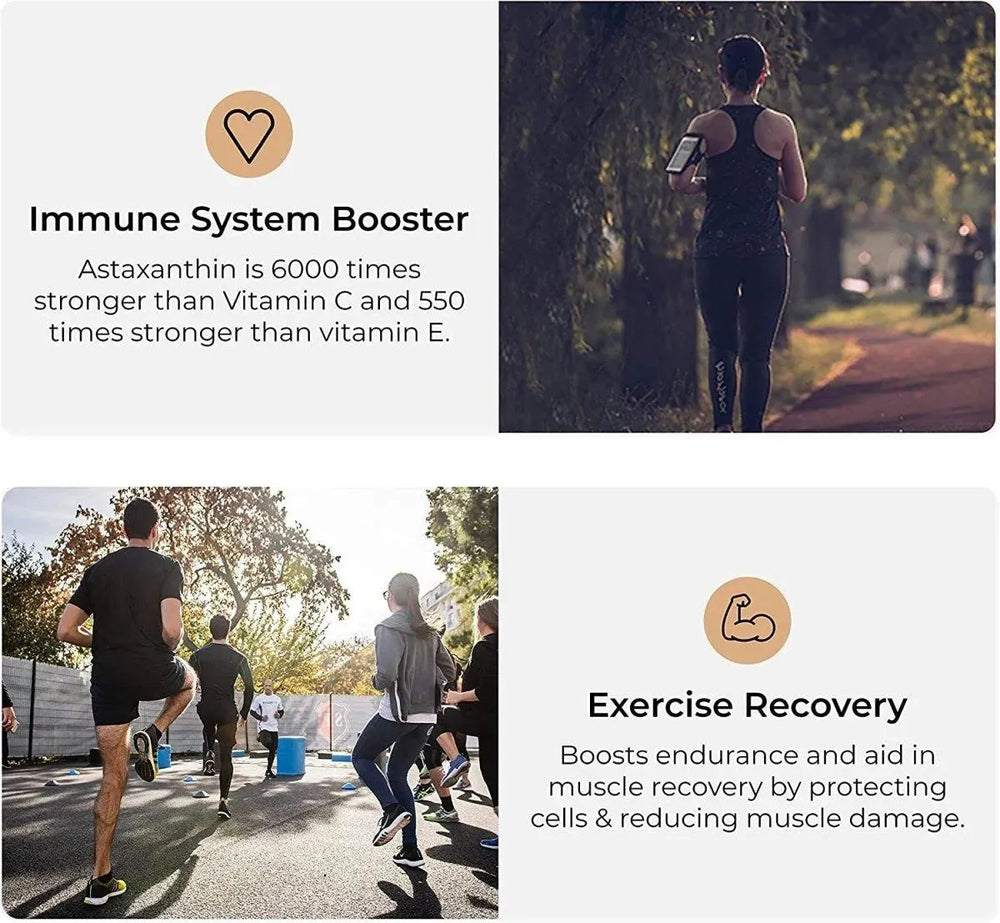• ANTIOXIDANTE MÁS FUERTE QUE LA VITAMINA C Y LA VITAMINA E - Potente antioxidante que ayuda a estimular su sistema inmunológico e inhibe la oxidación y el estrés oxidativo y puede prevenir la formación de radicales libres que dañan las células. La investigación muestra que la astaxantina es 6000 veces más fuerte que la vitamina C y 550 veces más fuerte que la vitamina E para eliminar los radicales libres.