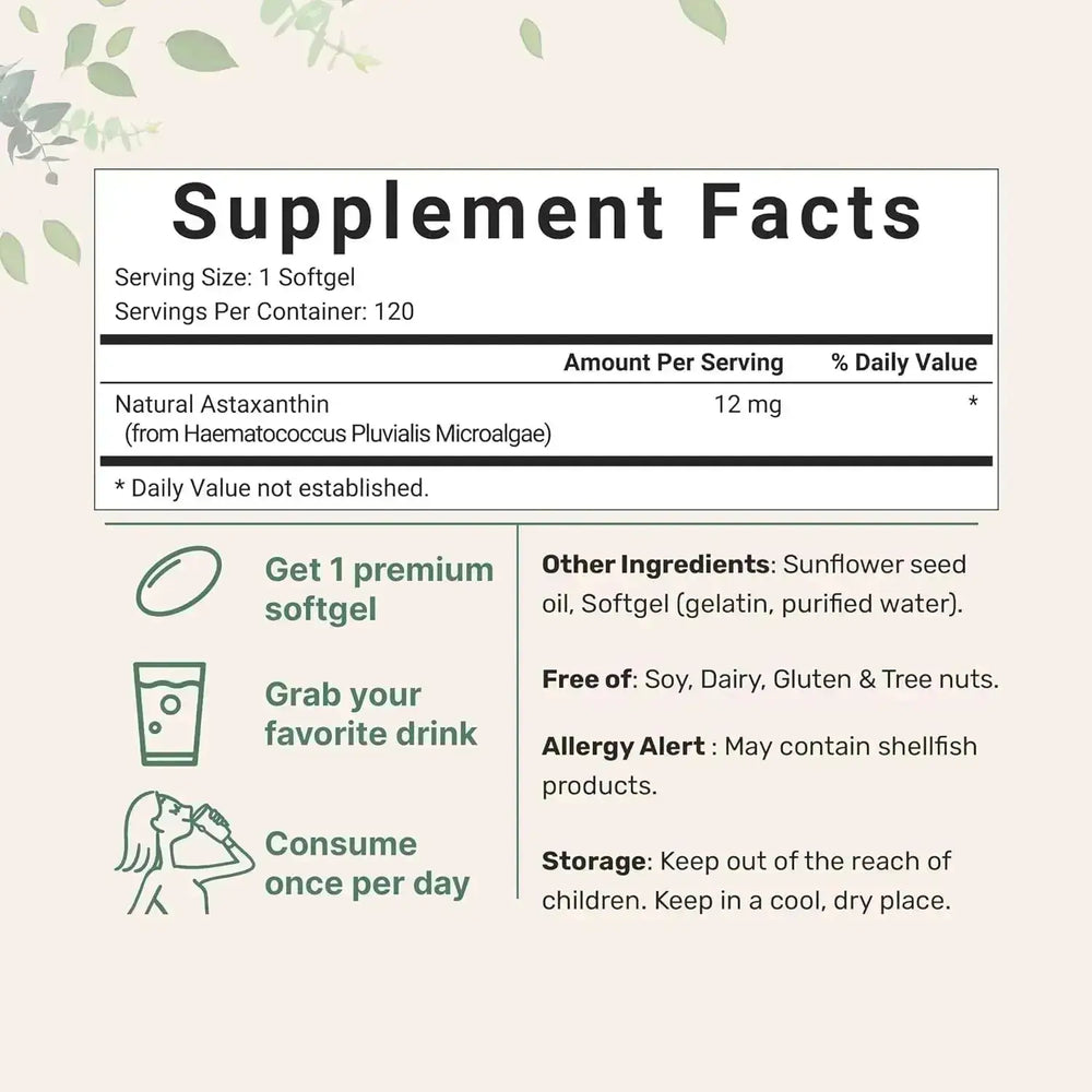 Cápsulas blandas de astaxantina natural de máxima resistencia de microalgas con aceite de semilla de girasol para una mejor absorción, 12 mg por píldora, 120 unidades, sin OGM y fáciles de tragar.