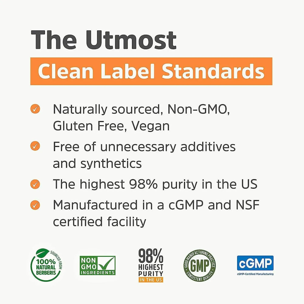 Clean Label Berberine tiene una pureza de berberina HCL sin precedentes del 98%, que es la MÁS ALTA en los EE. UU. (a partir de abril de 2022). En comparación, muchos suplementos de berberina HCL están estandarizados a solo 60 - 85% de pureza u omiten los niveles de pureza en las etiquetas.