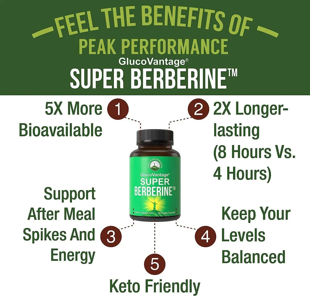 • ¿Por qué no multiplicar por cinco la absorción de berberina? Peak Performance GlucoVantage Super Berberine contiene dihidroberberina (DHB), un metabolito activo de la berberina. En comparación con la berberina normal, DHB ha demostrado ser hasta 5 veces más biodisponible/absorbible y 2 veces más duradero (8 horas frente a 4 horas)