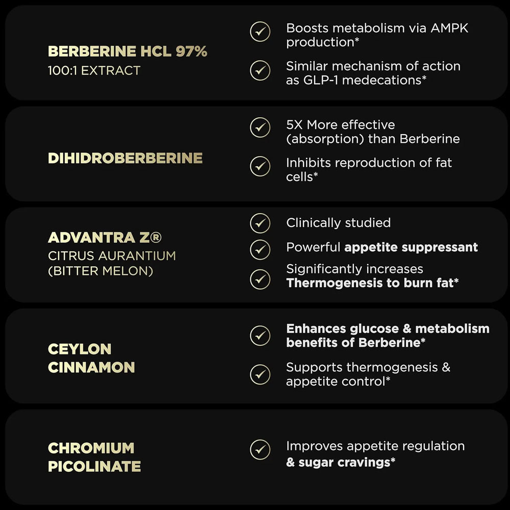 Un suplemento integral de GLP-1 para la pérdida de peso con ingredientes ampliamente estudiados y probados que han demostrado promover resultados paralelos de los antagonistas de GLP1 supresores del apetito para reducir el hambre y estimular el metabolismo, como berberina de potencia 100 veces mayor con canela de Ceilán, extracto de melón amargo de alta potencia estandarizado al 10 % de sinefrina y picolinato de cromo 1000 mcg.