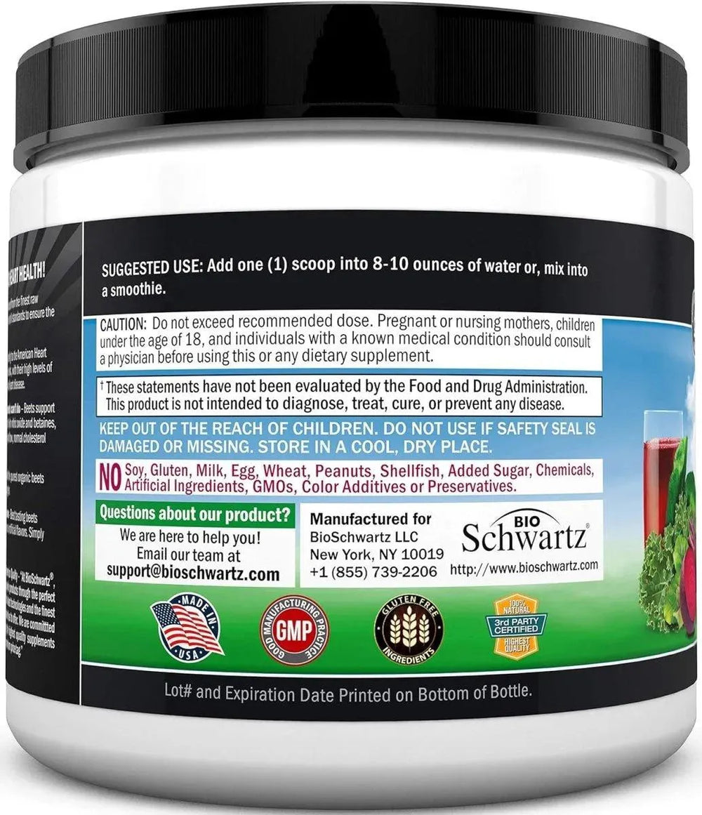 Pureza probada y libre de alérgenos: todos y cada uno de los lotes de superalimento de remolacha ultra pura de BioSchwartz son probados por terceros para garantizar una alta pureza, potencia y calidad. Esta fórmula ha sido fabricada sin OGM, soja, gluten, trigo, maní ni mariscos. También está libre de conservantes, rellenos, productos químicos o aditivos de color.