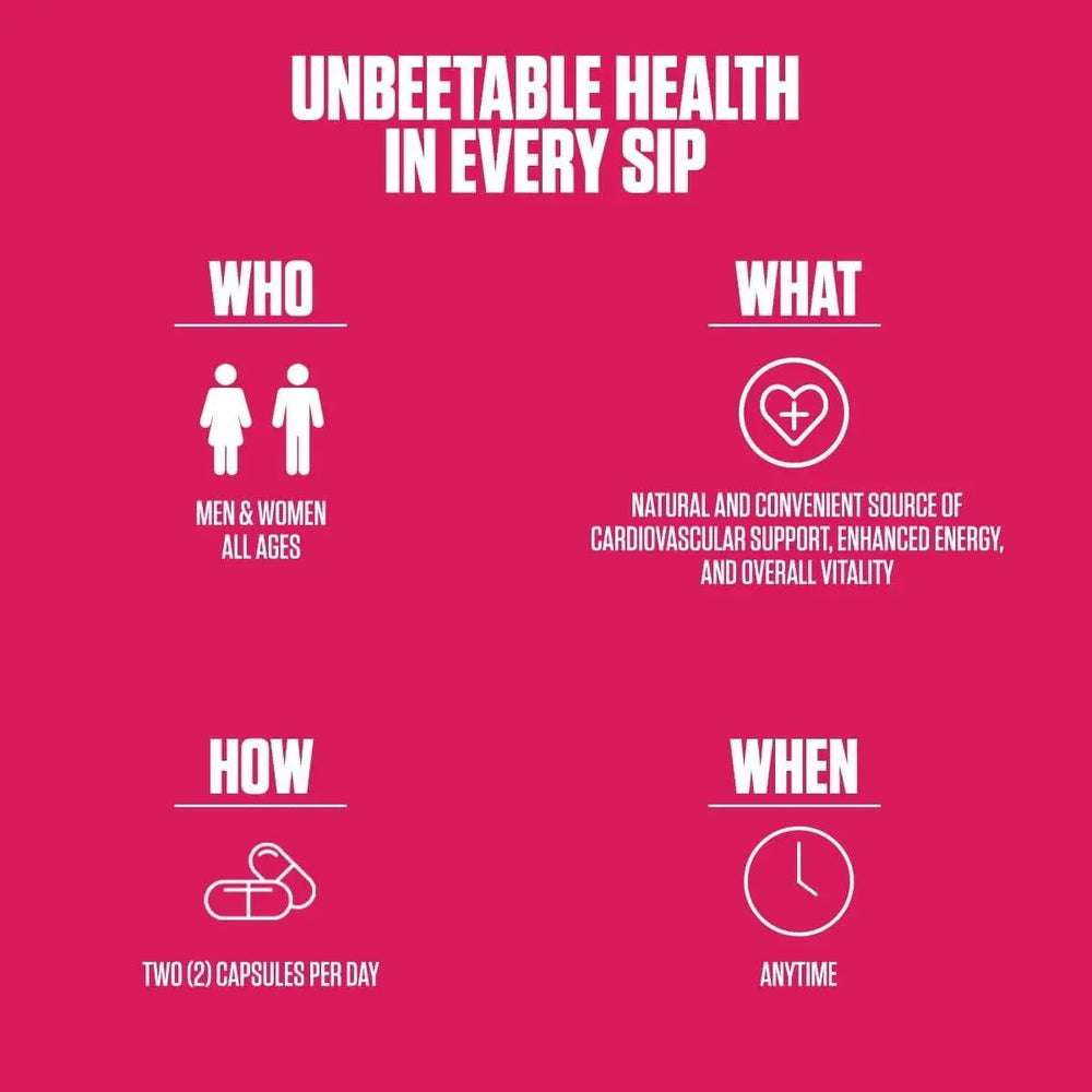 Aumento de energía: sienta el aumento de energía natural, ya que se sabe que la remolacha mejora la utilización del oxígeno en el cuerpo. Si usted es un atleta que busca esa ventaja adicional o alguien que busca un impulso de energía para las actividades diarias, nuestro suplemento lo tiene cubierto.