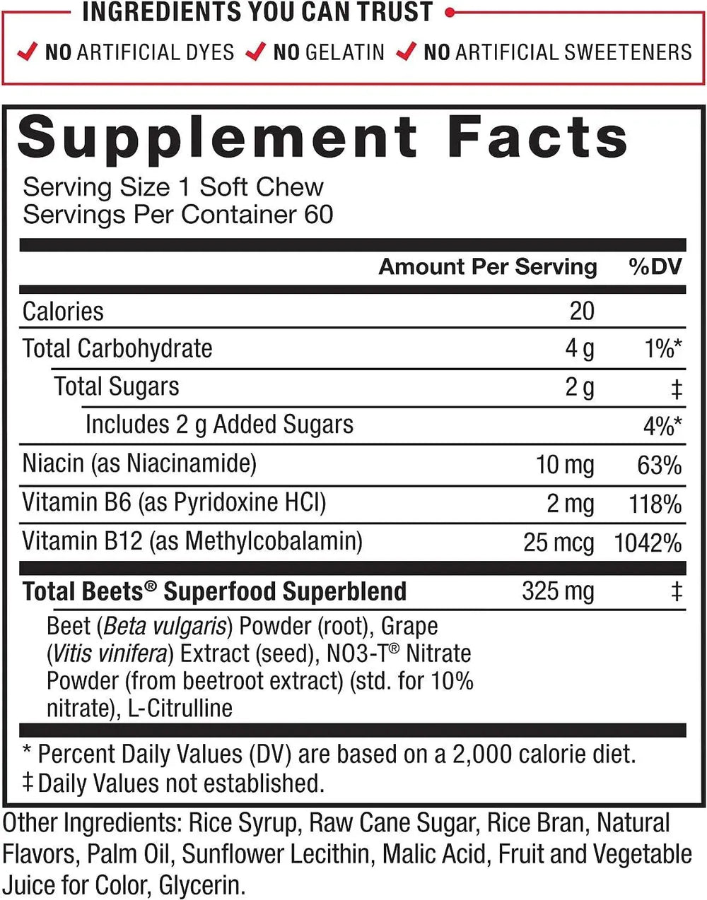 ENERGÍA SALUDABLE PARA EL CORAZÓN: Los masticables suaves Total Beets son una fuente segura de energía saludable para el corazón, sin estimulantes ni azúcares artificiales, lo que le brinda un impulso de energía en cualquier momento para enfrentar cualquier cosa que la vida le depare. Además, ¡son prácticos cuando estás en movimiento!