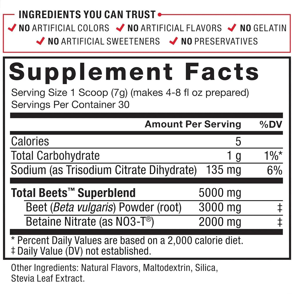 ENERGÍA SALUDABLE PARA EL CORAZÓN: El polvo de remolacha proporciona un impulso natural de energía saludable para el corazón sin estimulantes. Total Beets contiene 3 gramos de raíz de remolacha en polvo por porción y te ayudará a sentirte fresco durante todo el día, sin estrés cardiovascular.