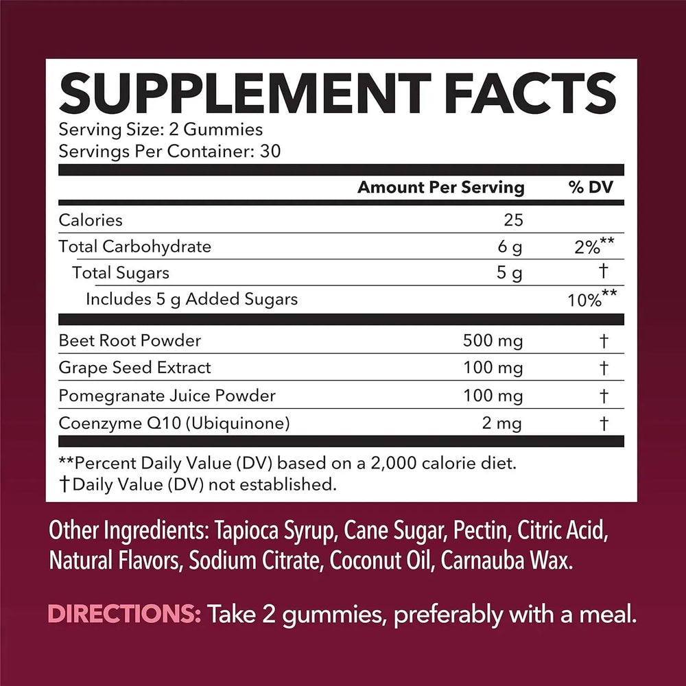 El polvo de raíz de remolacha combinado con extracto de semilla de uva, jugo de granada en polvo y CoQ10 se combinan para obtener los máximos beneficios. A medida que envejecemos, nuestra producción de CoQ10 disminuye naturalmente. Apoye su salud vascular y sus células con estas deliciosas gomitas energéticas.