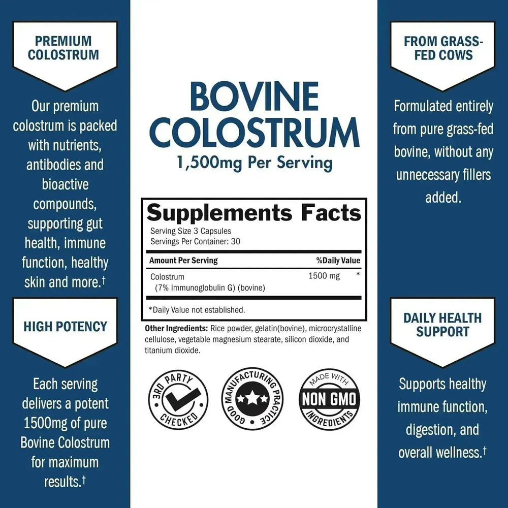 Solo del primer ordeño: nuestras cápsulas de calostro bovino alimentado con pasto se obtienen solo del primer ordeño, lo que garantiza la potencia óptima necesaria para un suplemento de calostro beneficioso