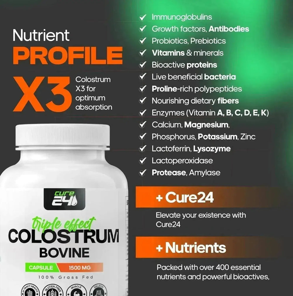 ELEVE SU EXISTENCIA con nuestro calostro x3, diseñado para una máxima absorción. Rico con más de 400 nutrientes esenciales y bioactivos potentes, incluidas enzimas, fibras dietéticas y una gran cantidad de vitaminas A, B, C, D, E y K, junto con minerales vitales como calcio, magnesio, zinc y más.