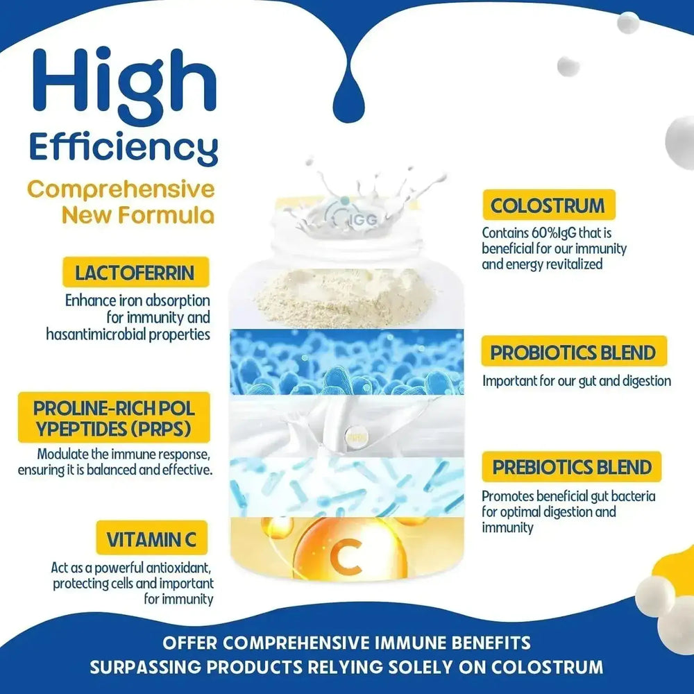 CALOSTRO PREMIUM CON 60 % DE IGG: Experimente el calostro de mayor calidad disponible, repleto de 60 % de inmunoglobulina G (IgG). Esta fórmula es beneficiosa para nuestra inmunidad, promueve la revitalización de la energía y el desarrollo para todas las edades.