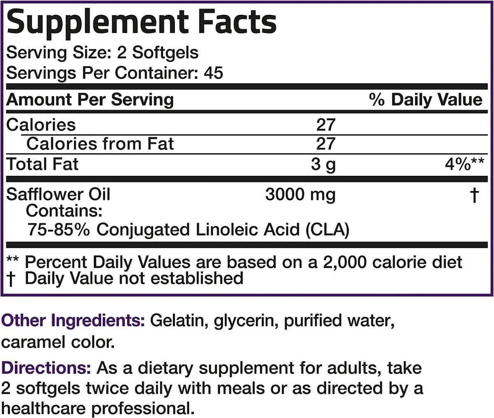 • Potencia extra alta: 2250 mg de CLA activo por porción (2 cápsulas blandas). Apoya naturalmente el control saludable del peso* - Ácido linoleico conjugado no estimulante. 100 % cártamo sin OMG.