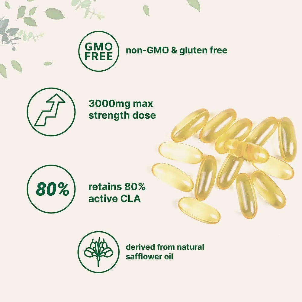 • Cápsulas de CLA (gel blando líquido), hechas con 80 % de CLA de aceite de cártamo, 3000 mg por porción, 300 unidades, sin OMG.