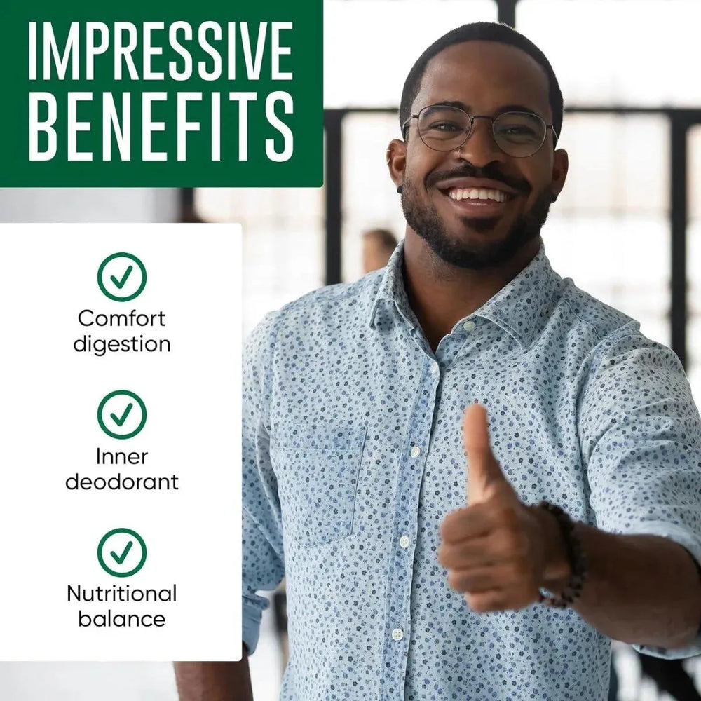No más olores corporales: ¡la clorofila se usa tradicionalmente como desodorante interno para mujeres y hombres de todas las edades! Trabajando de adentro hacia afuera, nuestro suplemento de clorofila descompone los compuestos que causan olores y neutraliza los olores desagradables como el sudor corporal y el mal aliento.