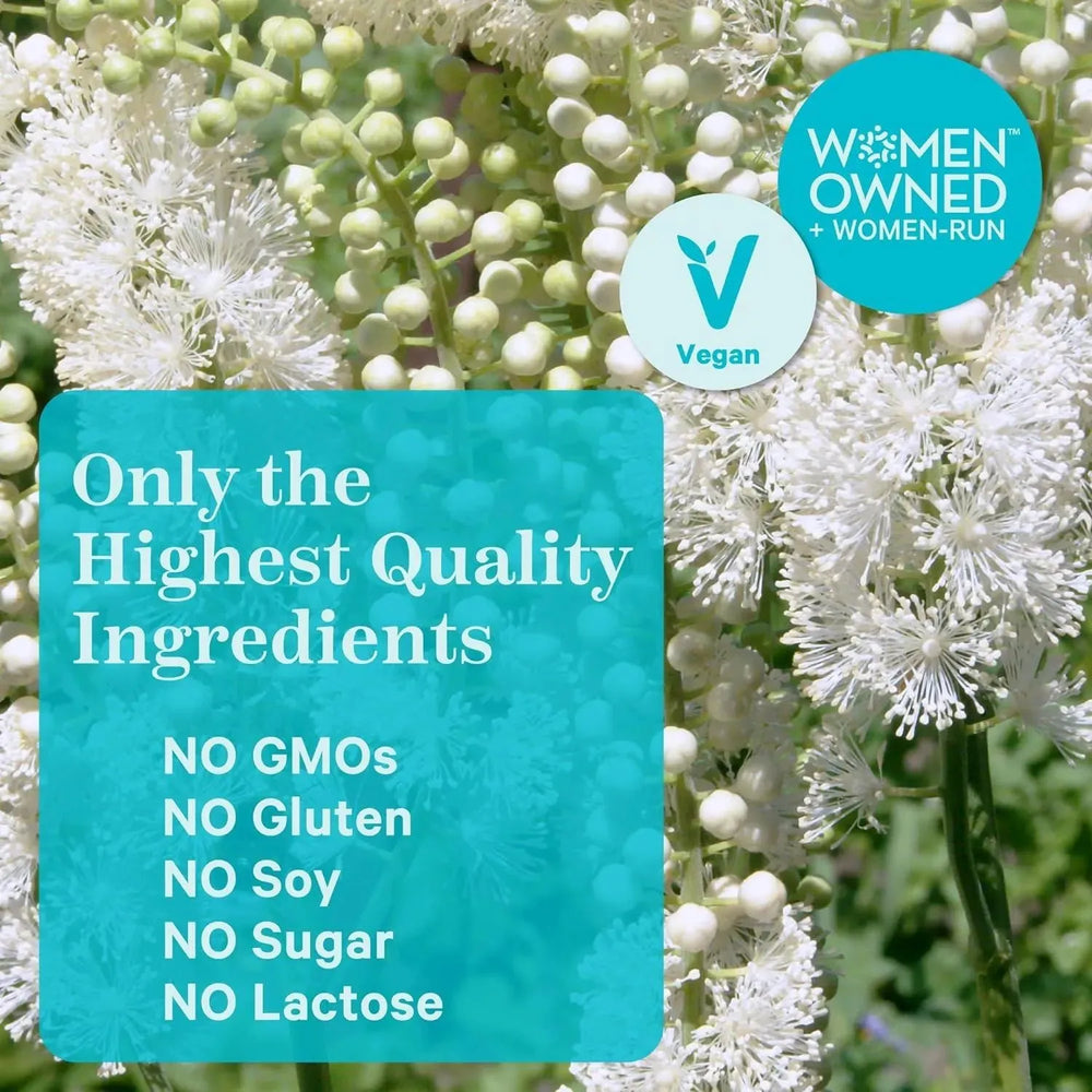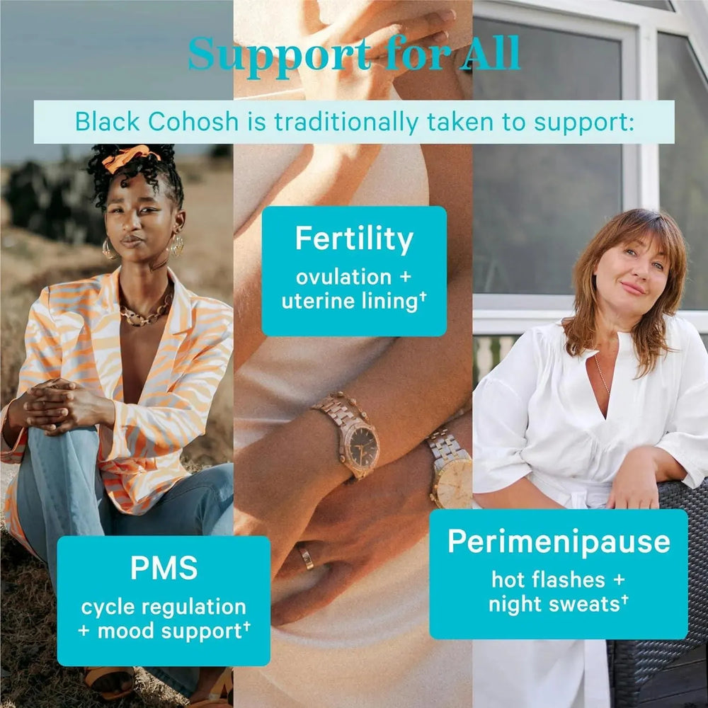 Apoyo a la fertilidad de las mujeres: Black Cohosh lo toman tradicionalmente las mujeres con TTC, no solo para ayudar a equilibrar las hormonas, sino porque apoya el revestimiento del útero para una implantación saludable después de la ovulación.