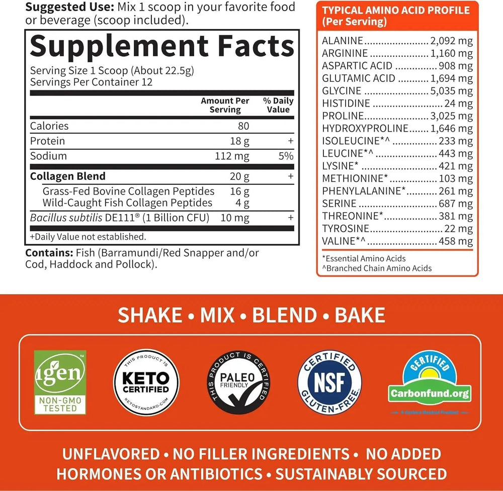 CAPTURADO SALVAJE Y ALIMENTADO CON PASTO: Centrados en la pureza, la calidad y la sostenibilidad, combinamos las dos fuentes de colágeno de la más alta calidad: pescado capturado en el medio silvestre y péptidos bovinos alimentados con pasto, creando colágeno de múltiples fuentes; 20 g de colágeno y mil millones de UFC de probióticos