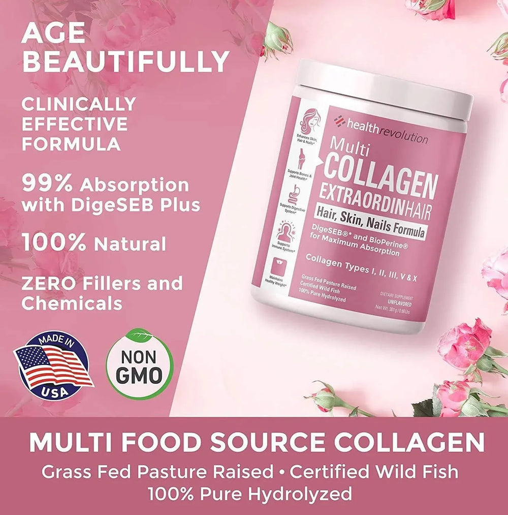 • Polvo de proteína de colágeno múltiple Max-Sorb: el polvo de proteína de colágeno múltiple Health Revolution es el primer suplemento de colágeno que se ha instantáneo para eliminar el 100% de los grumos que se obtienen con otras marcas, lo que le permite mezclarse sin esfuerzo para una máxima absorción y eficacia. Dale un impulso adicional a tu régimen de belleza y luce y siéntete más joven, vibrante y rejuvenecido solo con Max-Sorb.