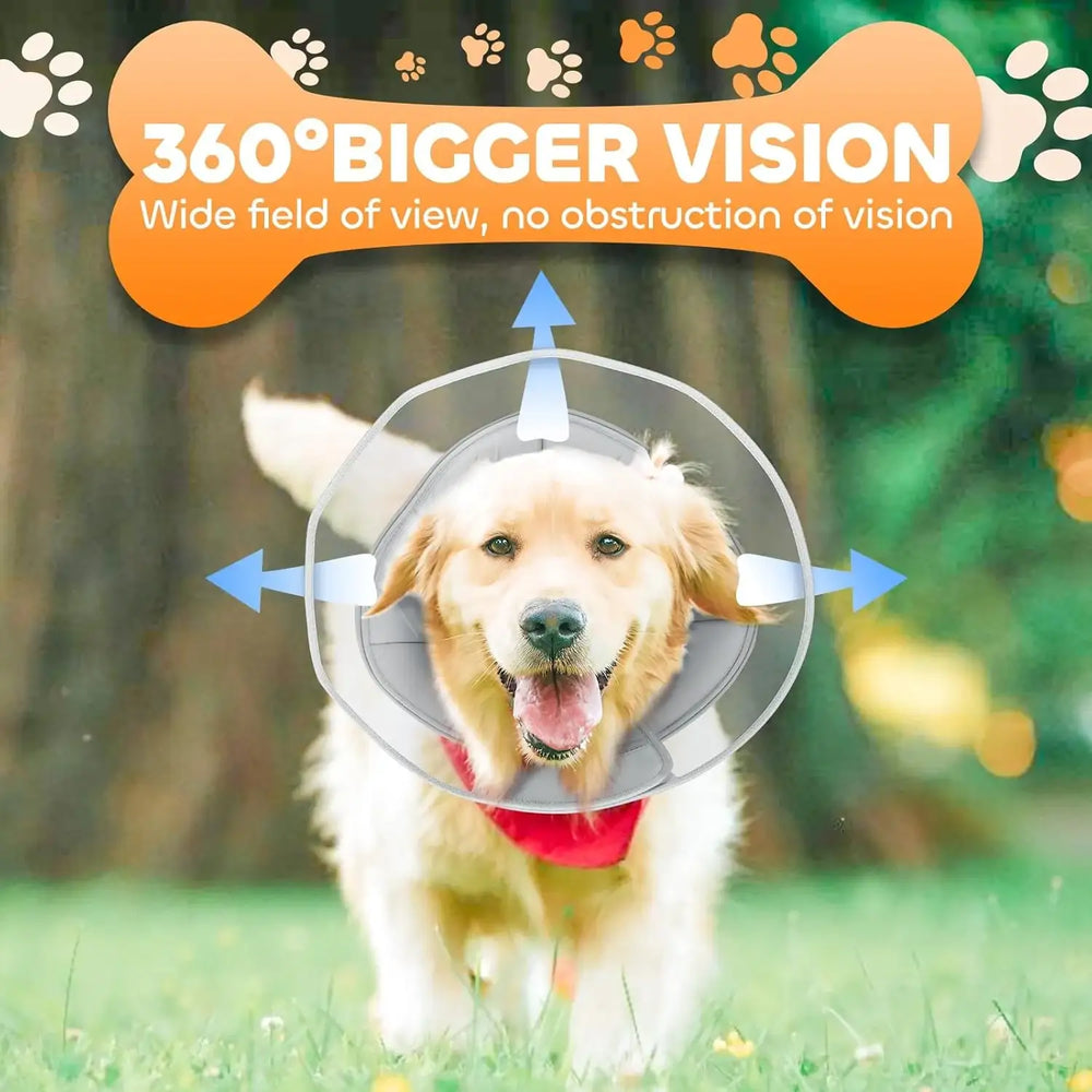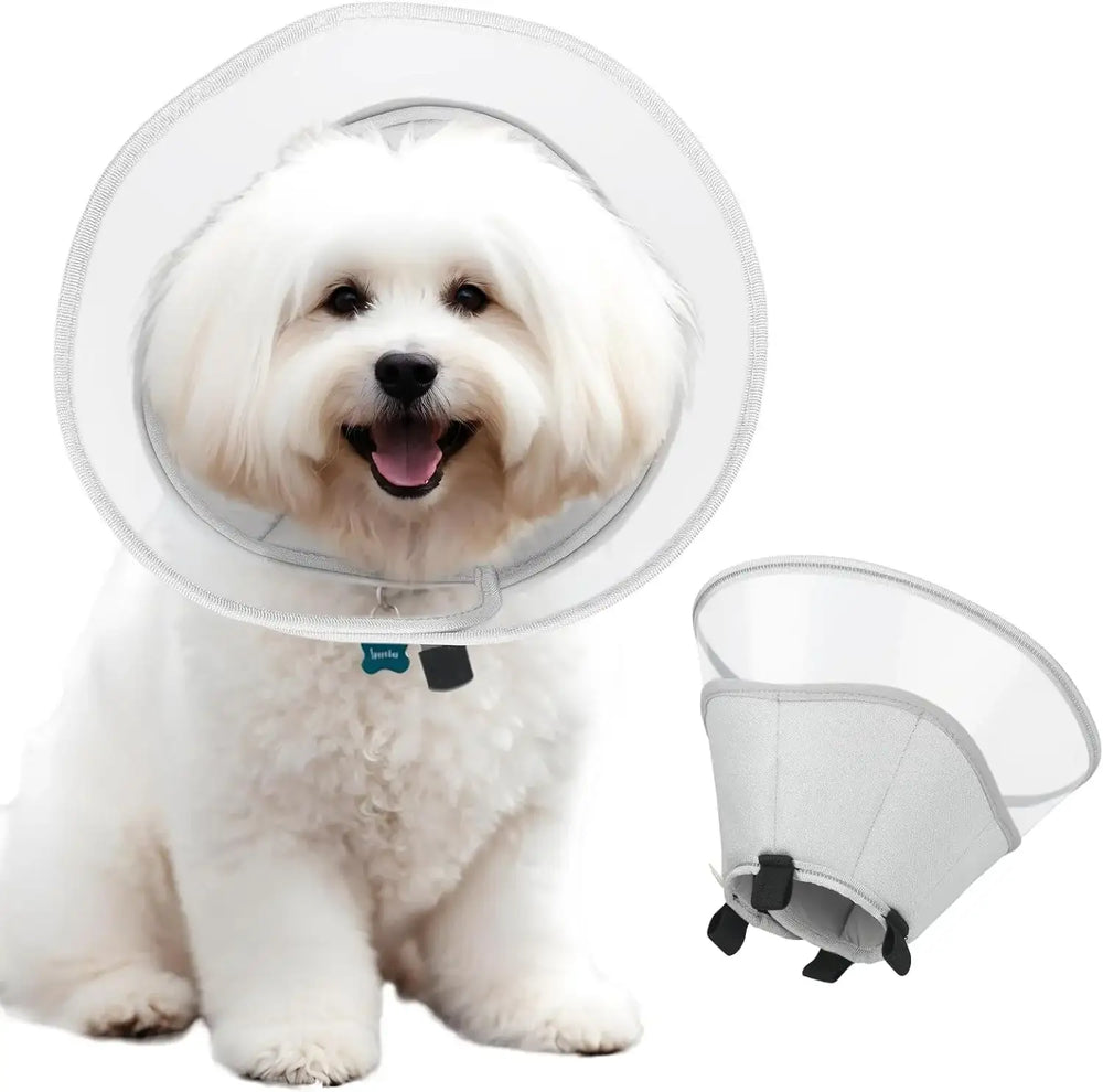 VISIÓN ULTRA GRANDE DE 360°: La capa superior del collar cónico suave para perros está diseñada con material de PVC translúcido, lo que ofrece una visión de 360° más amplia y sin obstrucciones, evitando colisiones y protegiendo a las mascotas de colisiones, permitiéndoles comer, beber, dormir y jugar fácilmente. Además, incorpora una película protectora antiarañazos en el material de PVC para evitar que el collar se raye durante el transporte y cuando su mascota lo usa. SEGURO Y CONFIABLE: Nuestro cono para perros pequeños está ampliado con velcro para facilitar el ajuste de la circunferencia del cuello. Además, cuenta con cuatro ganchos elásticos en la parte inferior, compatibles con el collar de uso diario de su mascota. Ofrece doble protección para evitar que su mascota se lama y muerda heridas al quitarse el cono.