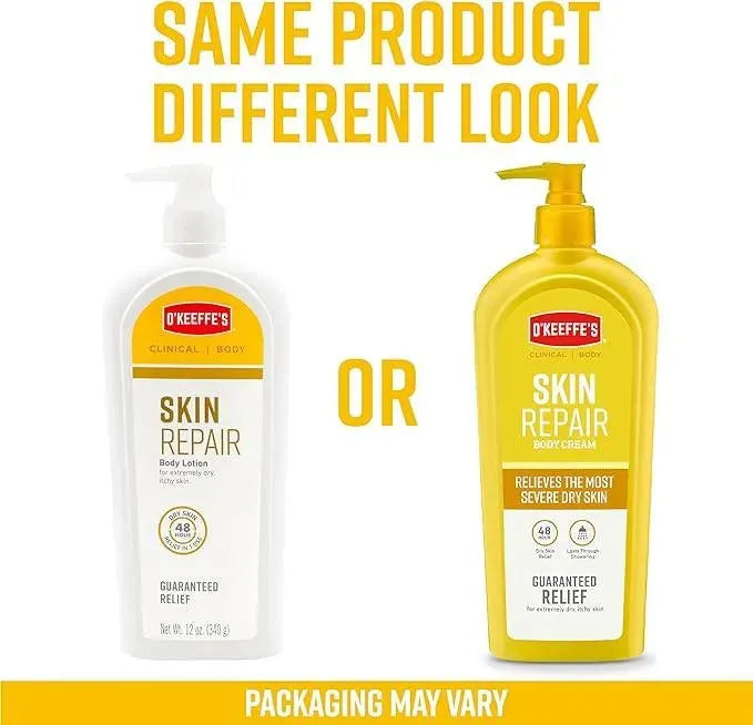 O'Keeffe's Skin Repair cura, alivia y repara la piel extremadamente seca y con picazón; El embalaje puede llegar en botellas de color blanco u dorado.