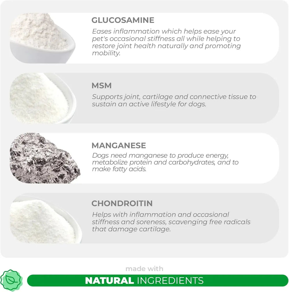 Para perros de todas las edades: Elaboramos nuestras tabletas con glucosamina, ideal para perros de todas las edades, ya que ayuda a preservar la integridad de las articulaciones y previene el deterioro de los huesos y el cartílago.