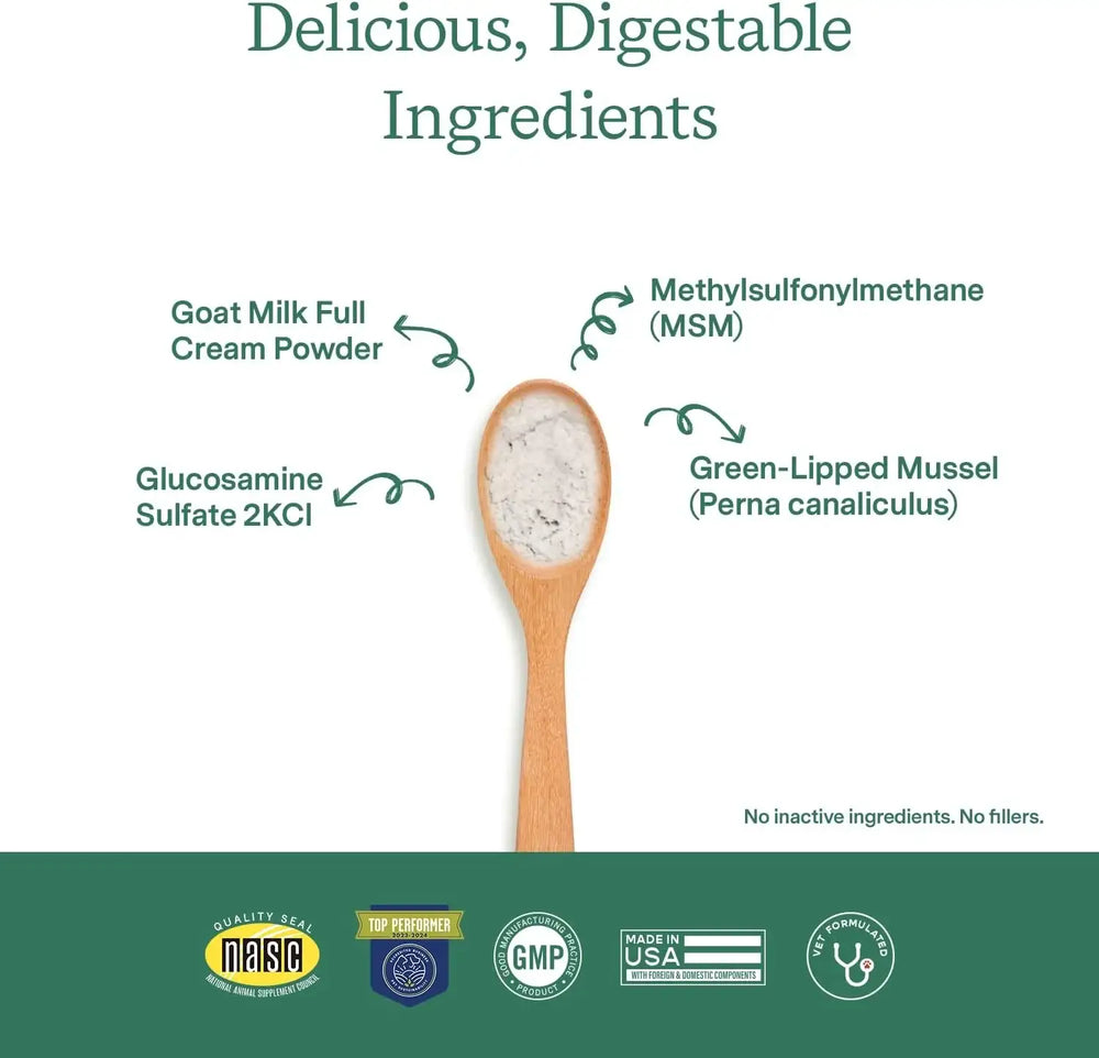Sin rellenos: El suplemento para caderas y articulaciones para perros, formulado con glucosamina, MSM y mejillón de labios verdes, ayuda a reducir la inflamación causada por el desgaste normal; elaborado con leche entera de cabra para una fácil digestión.