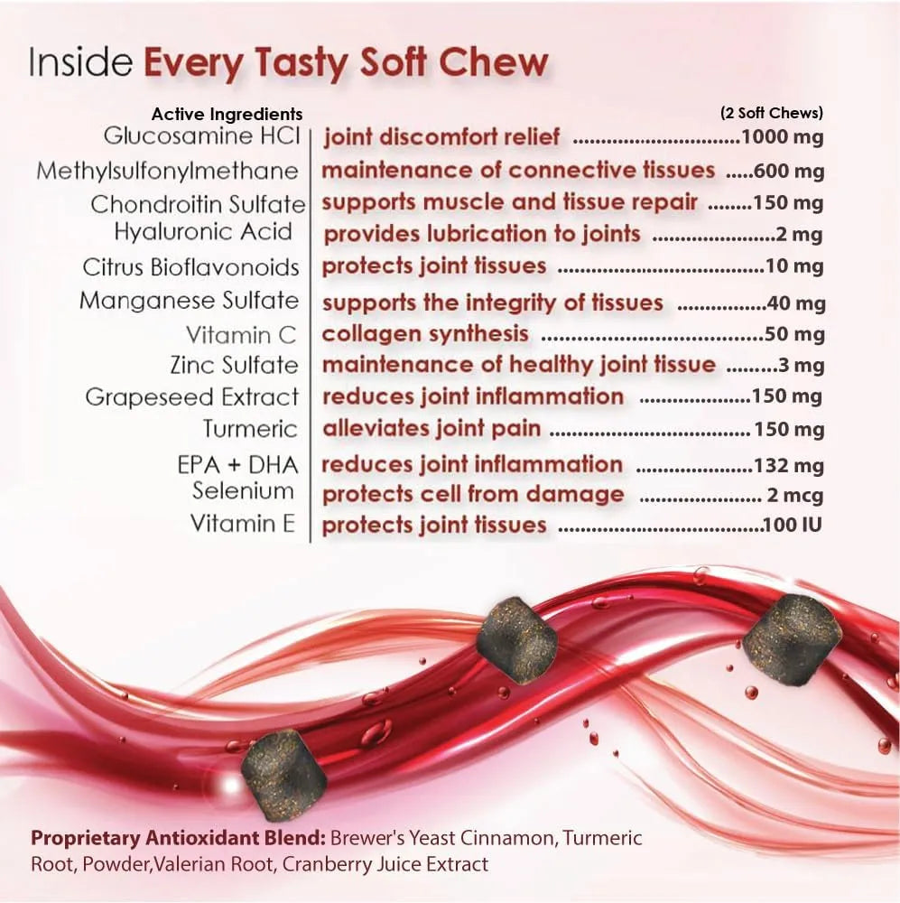 NUESTRA MEZCLA PATENTADA DE INGREDIENTES FUE SELECCIONADA PARA CUIDAR TODOS LOS ASPECTOS DE LA SALUD ARTICULAR: lubricación, amortiguación de los tejidos y soporte del cartílago, el tejido conectivo y los huesos. Nuestra fórmula también contiene antioxidantes que ayudan a reducir el estrés oxidativo. Este potente suplemento articular está diseñado para perros grandes, mayores o de mediana edad, o perros pequeños con necesidades máximas de soporte articular.