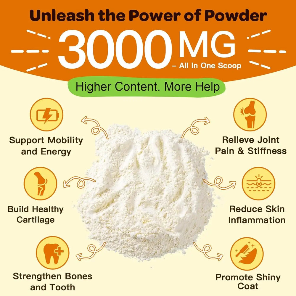 GLUCOSAMINA EN POLVO FÁCIL DE ADMINISTRAR: Si busca una dosis más alta de glucosamina que otros suplementos para las articulaciones, nuestro suplemento para la cadera y las articulaciones de perros es la mejor opción. El complemento para alimento para perros con sabor a salmón te permite ajustar la dosis a las necesidades de tu perro.
