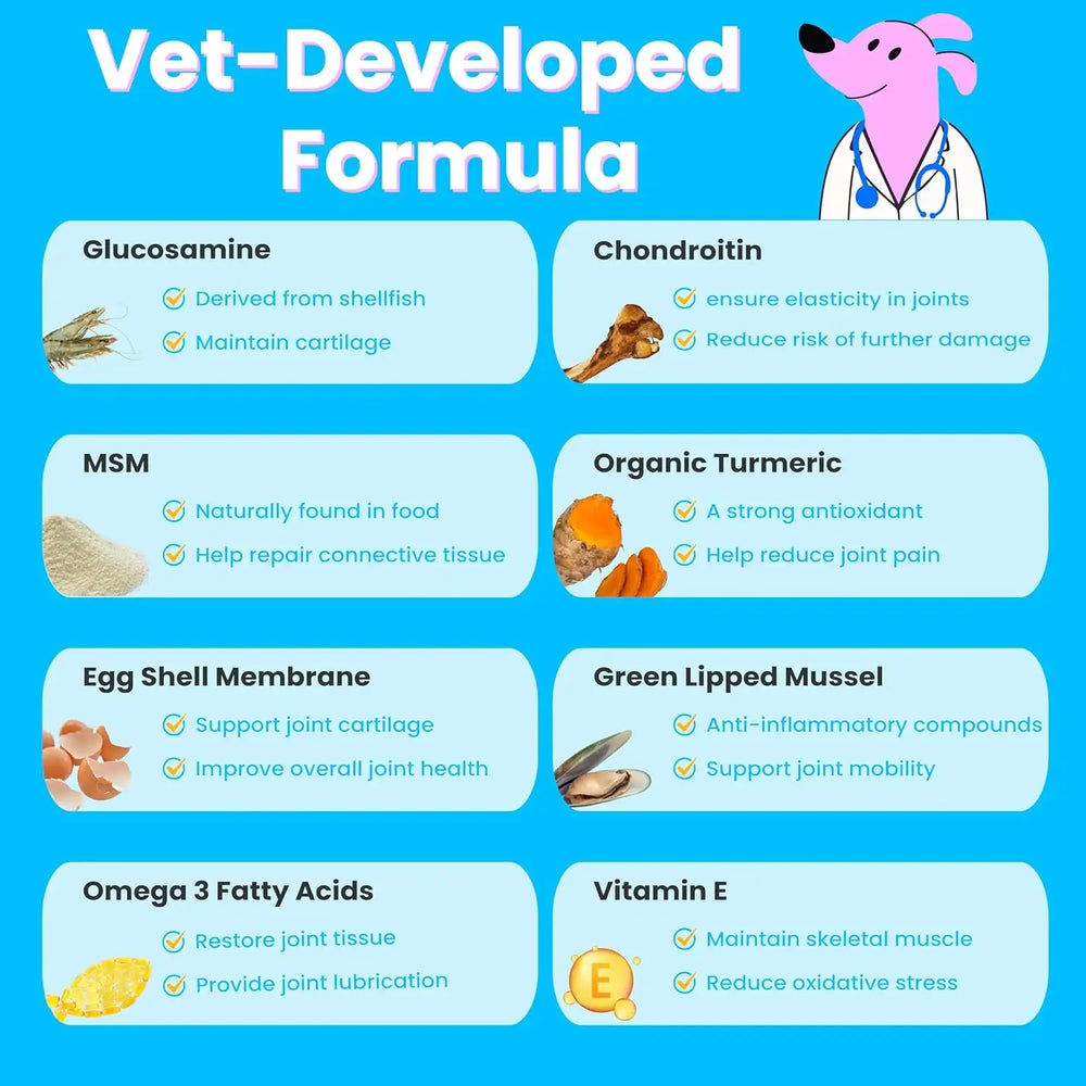 Delicioso y fácil de administrar: Dile adiós a los problemas con los suplementos: ¡nuestros masticables suaves con sabor a pollo convierten la hora del cuidado en la hora del premio! Incluso los cachorros más exigentes no se pueden resistir, lo que hace que sea muy fácil incorporarlos a la rutina diaria de tu perro. Sin polvos ni juegos de esconder pastillas: solo un delicioso masticable que a los perros les encanta.