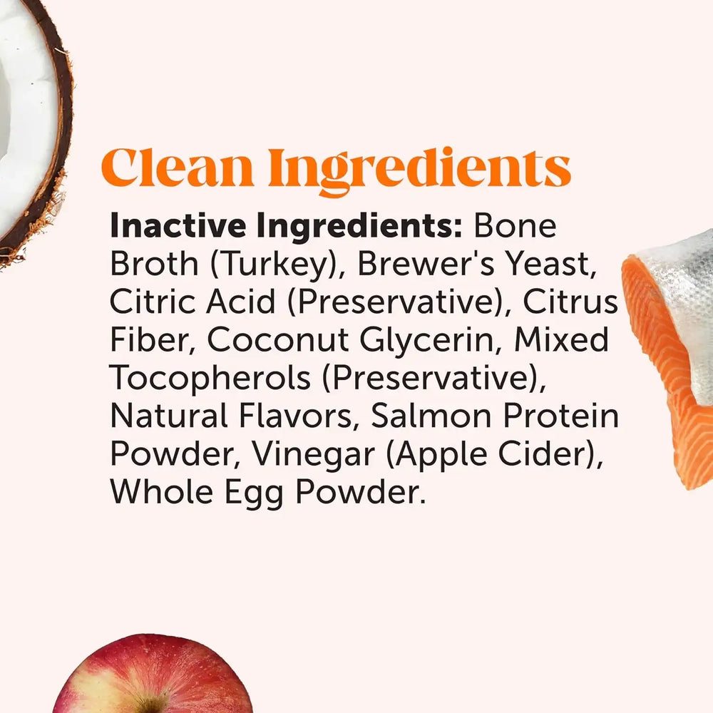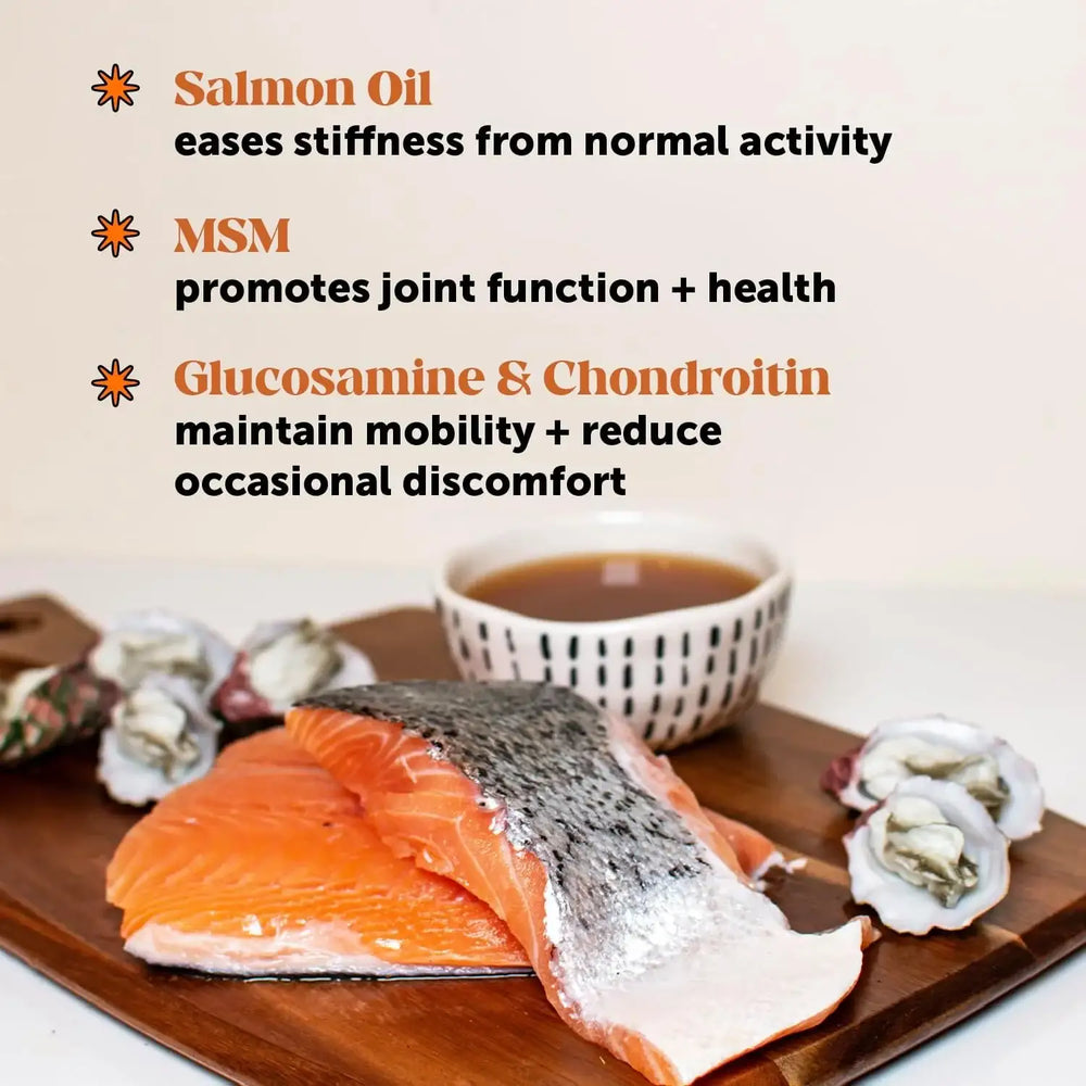 Hecho con ingredientes naturales como aceite de salmón, glucosamina, condroitina y más: Para el bienestar de tu cachorro, utilizamos ingredientes naturales que realmente funcionan. El aceite de salmón, rico en omega, mejora la movilidad, mientras que la glucosamina y la condroitina favorecen la salud y flexibilidad de las articulaciones. El MSM favorece la función articular, y el aceite de pescado beneficia las articulaciones, la piel, el cerebro, el corazón y la salud general. El caldo de huesos, rico en colágeno, aporta proteínas.
