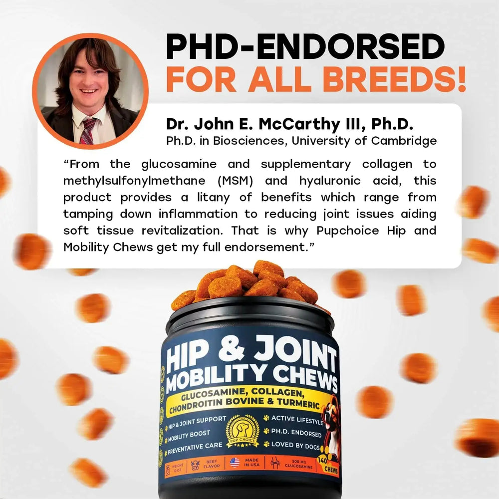 Potente soporte para caderas y articulaciones: ¡Brinde a su cachorro el máximo impulso de movilidad con una mezcla formulada por doctores con 500 mg de glucosamina, condroitina, colágeno y cúrcuma! Estos masticables suaves ayudan a lubricar las articulaciones, fortalecer el cartílago y promover la movilidad a largo plazo para todas las razas y tamaños.