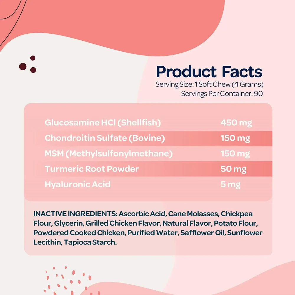 Hecho en Estados Unidos, aprobado por mascotas: olvídate de las fórmulas importadas de suplementos para articulaciones de perros de razas grandes y pequeñas y cuida a tu perro con nuestros deliciosos masticables para articulaciones sin rellenos de soya ni maíz.
