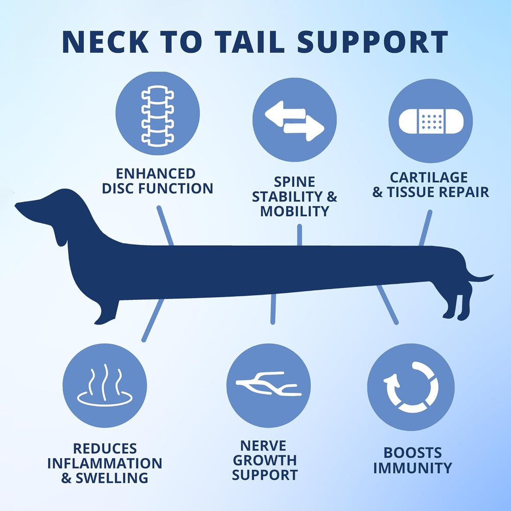 Soporte integral para la columna vertebral, desde el cuello hasta la cola: Especialmente diseñados para la salud espinal de los perros, estos masticables para discos y columna vertebral apoyan la función discal, mejoran la estabilidad espinal y ayudan a prevenir la degeneración discal, lo que los hace ideales para razas propensas a la enfermedad de disco intervertebral (EDIV). ¡Promueva una columna vertebral sana para una mascota feliz y activa!