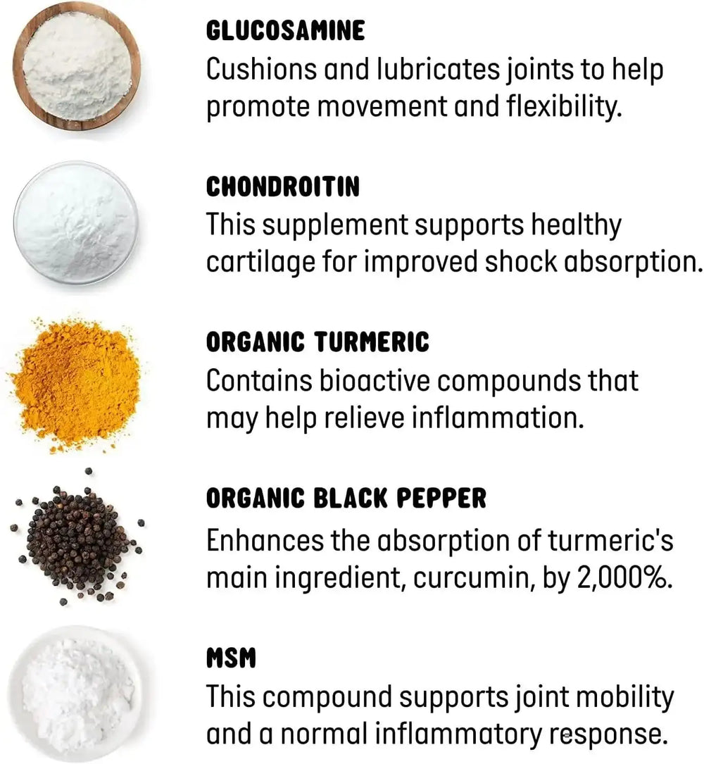 Ingredientes premium: glucosamina, condroitina, cúrcuma orgánica, pimienta negra orgánica y MSM. Junto con otros ingredientes, la vitamina C y la vitamina E se encuentran entre los ingredientes activos para el apoyo articular, huesos fuertes y mejorar la energía y la movilidad del perro.