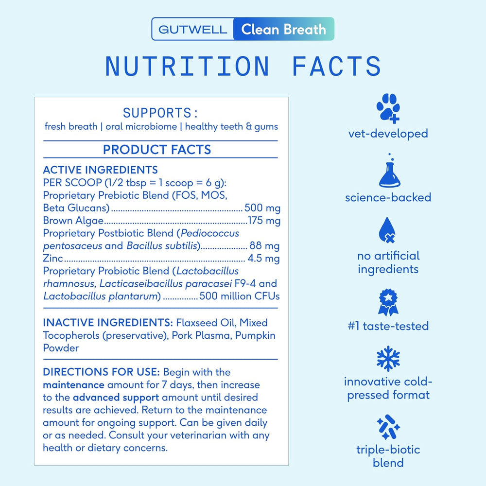 TRATA EL MAL ALIENTO DESDE SU ORIGEN: La mezcla patentada de prebióticos, postbióticos y probióticos de nuestro polvo dental para mascotas actúa como un potente refrescante del aliento canino, combatiendo el mal aliento desde su origen para reducir el olor, promover encías sanas y brindar un aliento realmente fresco a los perros, no solo un aliento mentolado.