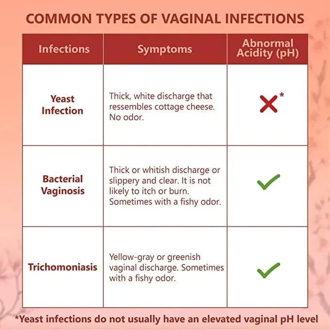 TIRAS DE PRUEBA DE PH: use un hisopo de algodón para recolectar una muestra de fluido vaginal y humedezca la almohadilla reactiva en la punta de la tira de prueba, espere 30 segundos y luego compárela con la tabla de colores. Revise la tabla de infecciones vaginales comunes en la parte posterior del paquete plano. NOTA: las infecciones por hongos generalmente no tienen un nivel de pH vaginal elevado, por lo que es posible que las tiras reactivas no cambien de color aunque experimente los síntomas enumerados. En este caso, proceda con el uso de los óvulos de ácido bórico.
