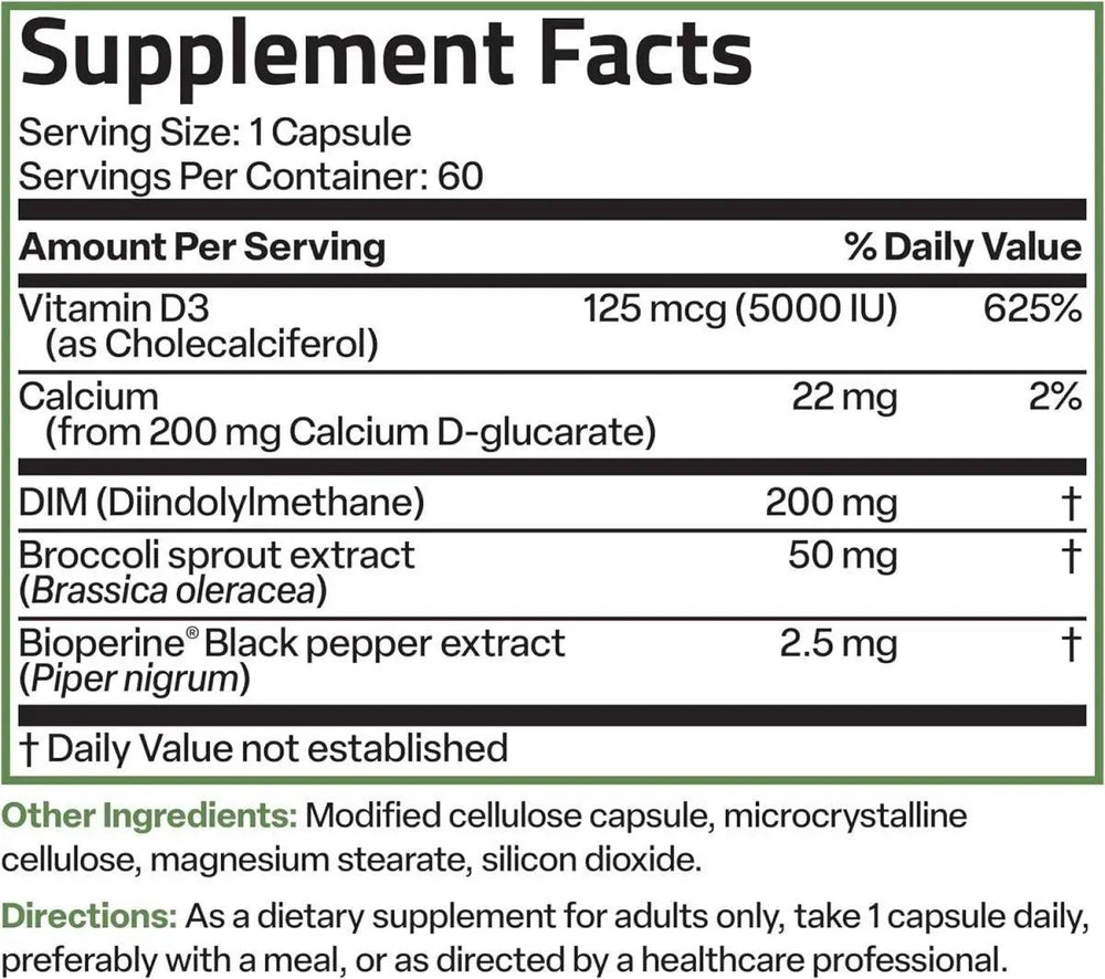 + D-glucarato de calcio, extracto de brotes de brócoli y vitamina D3: nuestra fórmula avanzada para el metabolismo del estrógeno también incluye D-glucarato de calcio, extracto de brotes de brócoli y vitamina D3 para un apoyo superior. DIM Balance + contiene extracto de pimienta negra BioPerine, que se ha demostrado que proporciona una absorción superior de nutrientes.